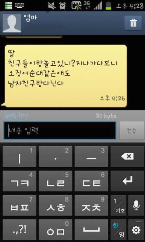 공개된 사진에는 엄마가 딸에게 "딸 친구들이랑 놀고 있니? 지나가다 보니 오징어순대 같은 애도 남자친구랑 다닌다"라는 문자를 보냈다.