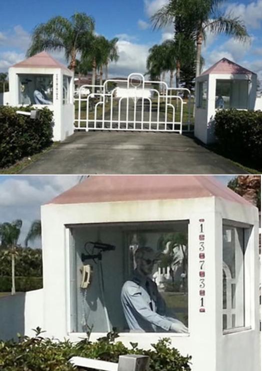 이 마네킹 경비원에 대해 게시자는 “아무리 벨을 눌러도 소리를 질러도 반응하지 않았다. 자세히 보려고 앞으로 가니 사람이 아니라 마네킹을 세워뒀다”며 “아무리 인건비가 비싼 외국이라도 안전을 위해서 경비원이 필요하지 않을까”라고 말해 폭소를 자아냈다. (경비원이 문 안 열어준 이유/ 사진-온라인 커뮤니티)