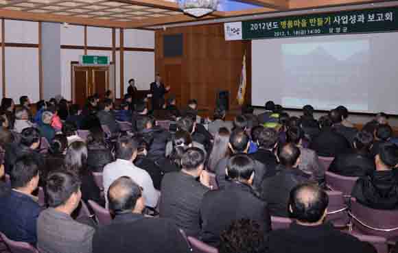 담양군은 최형식 군수를 비롯해 전정철 군의회 의장과 의원, 각읍면장, 마을대표와 주민자치위원장 등 마을 주민 등 200여 명이 참석한 가운데 담양문화회관에서 ‘2012년도 명품마을 만들기’ 사업성과 보고회를 개최했다고 21일 밝혔다.