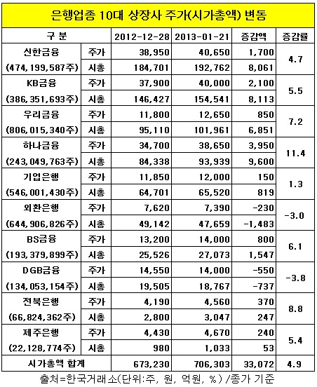하나금융을 포함해 신한, KB, 우리 등 10개 상장사는 시가총액 규모가 지난해 12월28일 67조3천230억원에서 올해 1월21일 70조6천303억원으로 3조3천72억원(4.9%) 늘어났다.