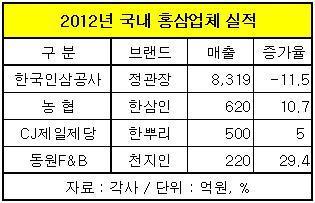 홍삼 시장 70%이상을 차지하는 정관장의 매출이 지난해 두자릿수로 줄어드는 반면 농협 CJ제일제당 동원F&B등 후발주자들은 시장을 한발한발 늘려가고 있다.