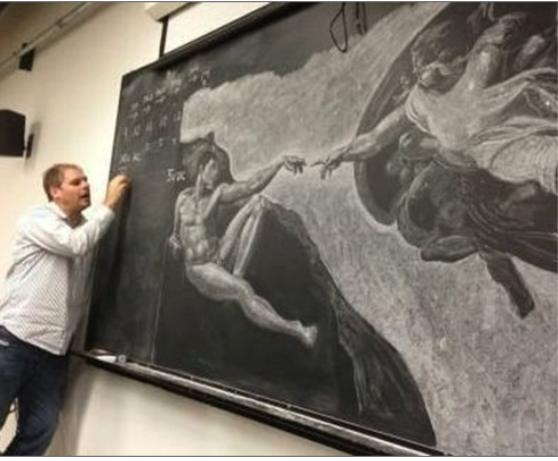공개된 사진에는 미술선생님이 칠판에 분필로 미켈란젤로의 '천지창조'를 그려 놓았다.