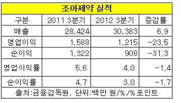 조아제약의 작년 3분기까지 매출은 303억8천만 원, 영업이익은 12억2천만 원, 당기순이익은 9억900만 원으로 이었다. 전년대비 매출은 6.9%늘었지만 영업이익과 당기순이익은 각각 23.5%, 31.3% 급락했다.