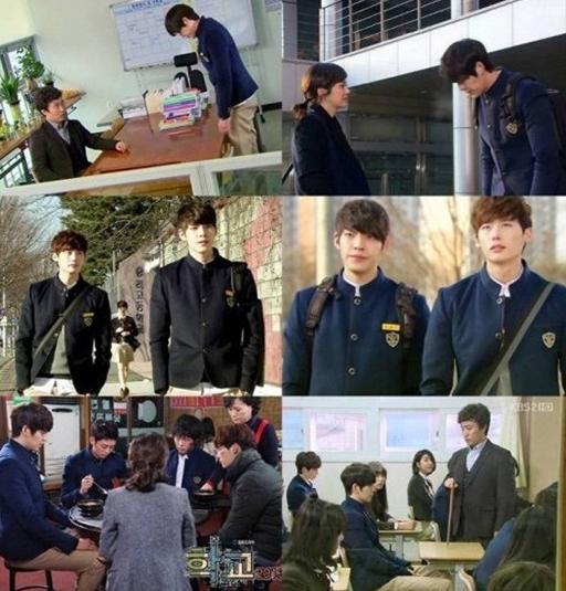 사진 속 김우빈은 극중 선생님인 엄효섭과 장나라를 향해 공손히 인사를 하고 있는 모습과 교복을 단정하게 입은 모습을 보여주기도 했다.