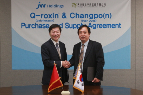 22일 JW홀딩스(대표 이경하)는 중국 천진그린파인제약에 총 1080만불 규모의 국산 4호 신약인 퀴놀론계 항균제 큐록신과 프리미엄 염색약 창포엔 수출계약을 체결했다고 밝혔다.