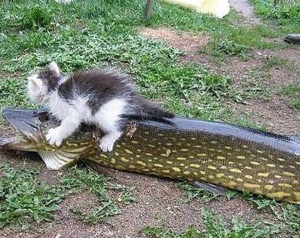공개된 사진 속에는 작은 새끼 고양이 한 마리가 큰 물고기 위에 올라타 털과 발톱을 세우며 위협적인 모습을 보이고 있다.