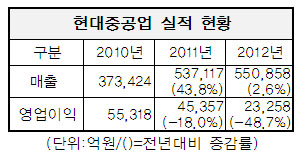 현대중공업의 지난해 3분기 누적 연결 매출은 40조8천377억원으로 2011년 동기 39조1천899억원보다 4.2% 증가했지만 영업이익은 1조9천 217억원으로 2011년 3조7천억원에 비해 47.4%나 감소했다.