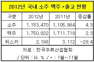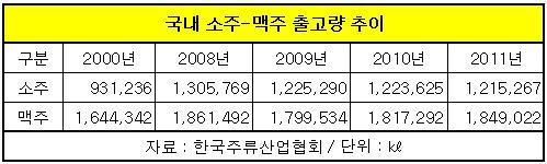 지난 2009년 이후 계속 하락세에 있던 소주 출고량이 지난해에 증가세로 반전했다.