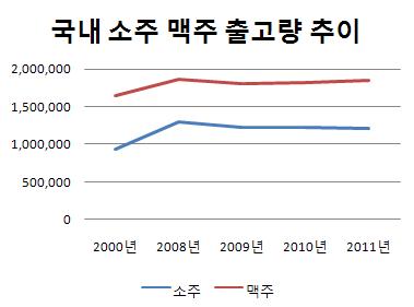 이처럼 소주 출고량이 증가세로 돌아선 것은 경기침체로 인해 소비자들이 위스키 등 고가의 주류 보다는 저렴한 소주와 맥주를 더 즐겼고, 그 중에서도 가격 대비 도수가 높은 소주를 훨씬 더 애용했기 때문으로 풀이된다.