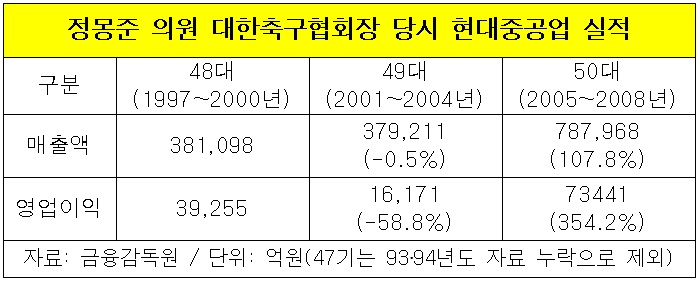 실제 현대중공업만 하더라도 정몽구 새누리당 의원이 47~50대 축구협회장을 역임했던 시기에 비약적 발전을 거듭했다. 특히 정 의원이 마지막으로 축구협회장을 역임했던 50대(2005~2008년)에는 49대(2001~2004년)보다 성장세가 가파랐다.