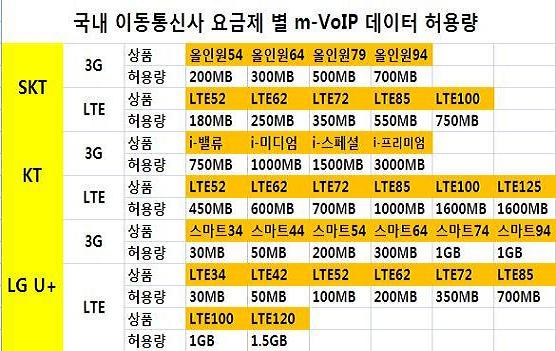 현재 국내 주요 이통3사 모두 3G와 LTE 사용자에 대해 모바일 인터넷 전화(m-VoIP) 데이터 허용량 제한을 두고 있다.
