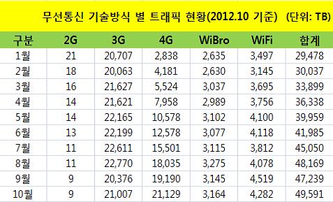 ▲ 2012년 10월 기준 월 별 트래픽 현황(출처: 방송통신위원회)