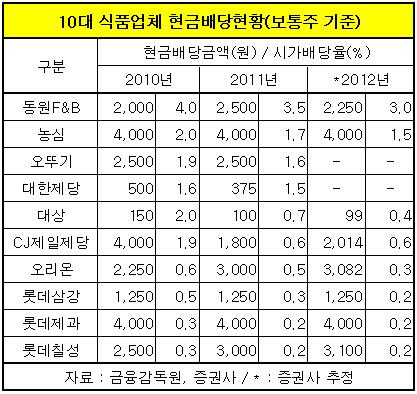 반면 식품업계 1, 2위인 CJ제일제당과 오리온을 비롯한 대부분의 업체들은 시가배당률이 1%에 못 미칠 것으로 보인다.