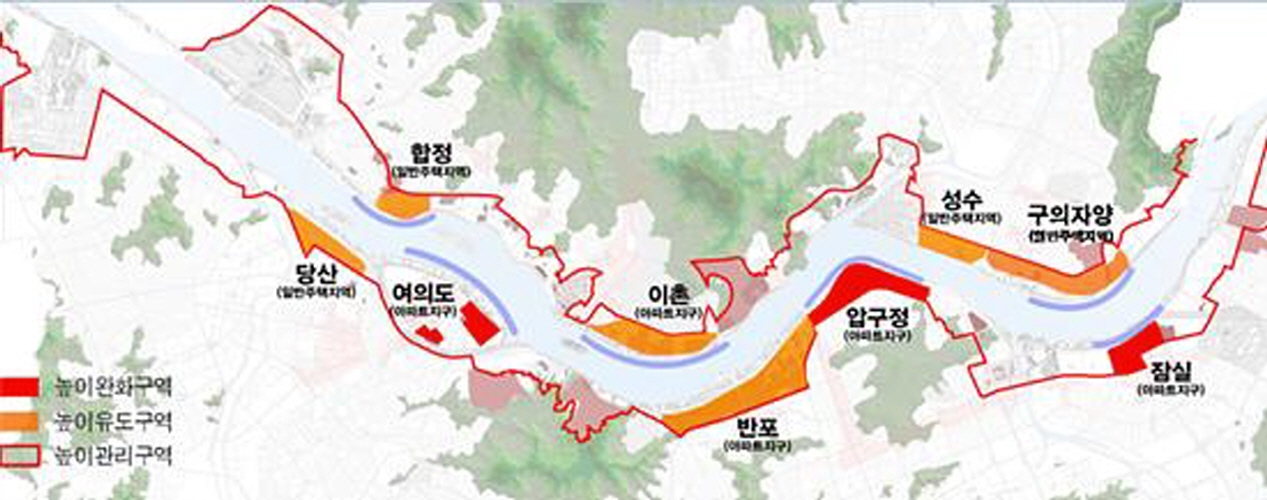시는 이날 공청회를 통해 한강변 재건축아파트 중 여의도와 잠실 비주거지역만 최고 50층까지 건립할 수 있고 나머지는 층수 35층, 용적률 300%이내로 제한한다고 밝혔다.