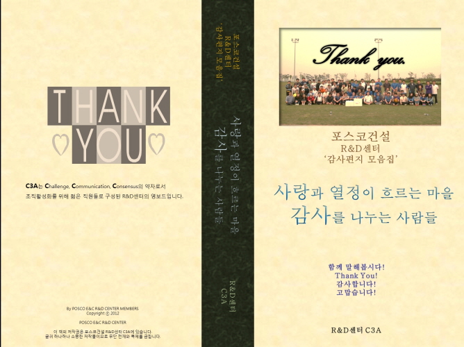 25일 포스코건설 R&D센터는 최근 감사나눔 활동을 기념하고자 ‘사랑과 열정이 흐르는 마을’이라는 제목으로 임직원들이 주고받은 편지를 책으로 편찬했다고 밝혔다.