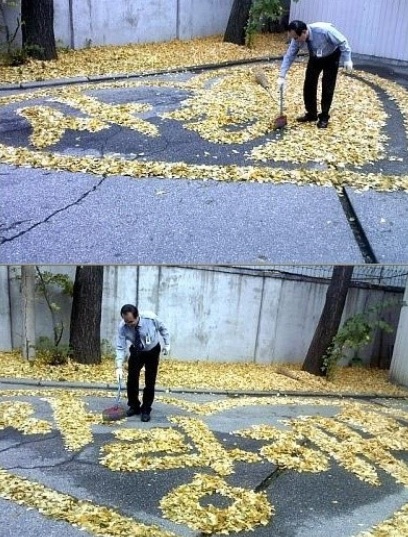 사진은 지난 가을 '수위아저씨가 다크나이트'라는 제목으로 올라온 것으로 학교 수위아저씨가 낙엽으로 정성스레 장식한 사진.