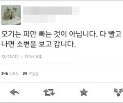 게시물에는 "모기는 피만 빠는 것이 아닙니다. 다 빨고 나면 소변을 보고 갑니다"라는 글이 적혀있다.