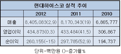 29일 금융감독원 공시자료에 따르면 현대하이스코는 지난해 매출 8조4천억원 영업이익 4천350억원을 기록한 것으로 잠정집계 됐다.