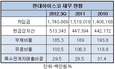 지난 2010년 1조4천억원이던 차입금이 1조7천400억원으로 치솟은 반면, 현금지급 능력을 보여주는 유동비율은 2010년 118.8%에서 2011년 106.3%, 2012년 3분기 103.5%로 점차 낮아지고 있다.