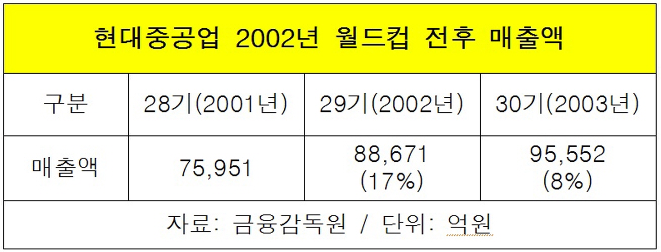 실제 현대중공업만 하더라도 정몽구 새누리당 의원이 49대(2001~2003년) 축구협회장 역임시절 개최했던 한일월드컵(2002년)의 수혜를 단단히 봤다. 2002년 현대중공업은 8조8천억원의 매출을 올려 전년 대비 매출액이 17%나 급증했다. 월드컵이 끝난 2003년에도 2002년 대비 7천억여원이나 매출액을 늘렸다.
