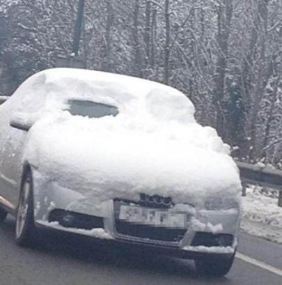 '무섭게 게으른 운전자'라는 설명이 붙은 이유는 사진 속 차량의 상태 때문으로, 자동차 위에 엄청난 높이로 쌓인 눈을 다 치우지 않고 운전석 부분의 시야가 겨우 확보될 만큼의 눈만 치운 모습인 것.