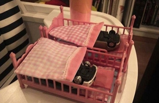 공개된 ‘딸에게 사준 장난감 자동차’ 게시물을 살펴보면 유아 식탁 위에 분홍색 장난감 침대 두 개가 나란히 붙어있다.