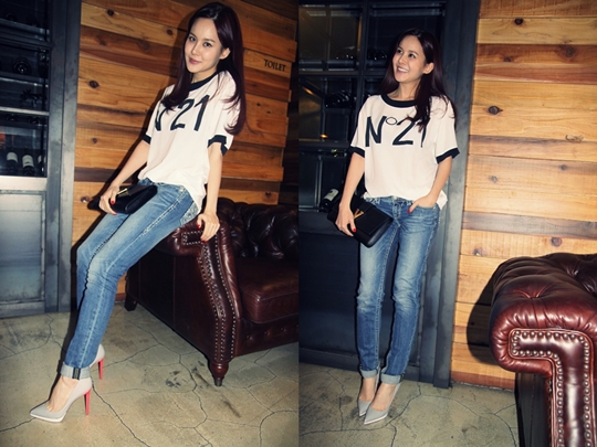 사진 속 아이비는 심플한 흰 티셔츠에 블루진을 매치해 스타일리시한 모습이다. 또한 스틸레토 힐과 롤업 데님을 매치한 스타일링 비법을 공개해 눈길을 끈다.