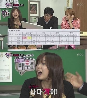 이날 공개된 고은아의 성적표에는 수우미양가 중 '가'만 가득했다. 이에 정준하는 "가가 나쁜 거 아니냐"며 농담을 하기도 했다. 특히 공개된 고은아의 고등학교 2학년 때 국어 과목 성적은 전교 453명 중 꼴찌여서 눈길을 끈다.