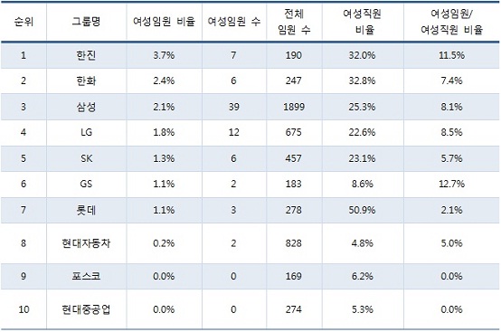 10대그룹 중 여성 임원 비율이 높은 곳은 한진→한화→삼성→LG→SK→GS→롯데→현대차의 순이었다. 포스코와 현대중공업은 여성 임원이 한명도 없었다.