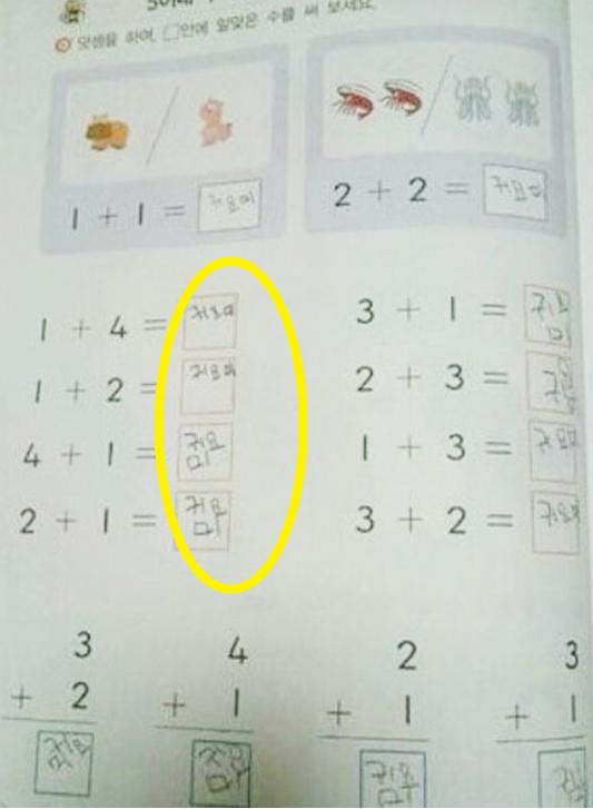 이 문제집에는 초등학생이 1+1에도 '귀요미'라는 답을, 1+2에도 '귀요미'라는 답을 적어 놓았다.