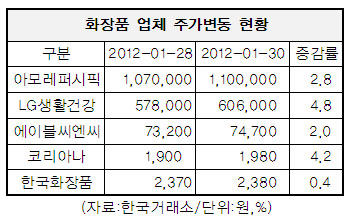 31일 한국거래소에 따르면 아모레퍼시픽, LG생활건강, 에이블씨엔씨 등 국내 주요 화장품업체들의 주가가 이틀 연속 상승세를 탔다. 시가총액으로는 6천억원이 넘게 증가했다.