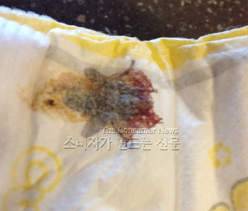 지난 12월12일 기저귀를 사용하려고 포장지를 뜯는 순간 박 씨는 경악했다. 기저귀 속에 파리로 추정되는 벌레가 피와 함께 눌러 붙어 있었던 것.