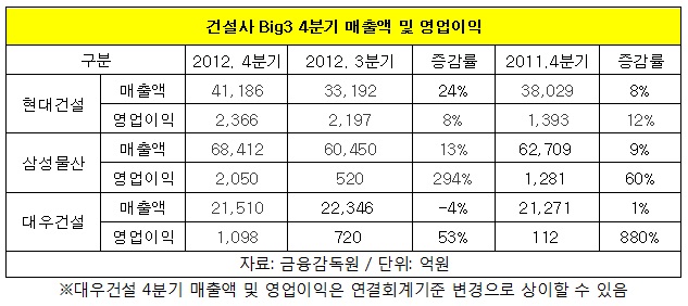 1일 재벌및 CEO, 기업경영성과 평가 사이트인 CEO스코어(대표 박주근)에 따르면 빅3 건설사들의 2012년 4분기 매출액은 3분기(6~8월) 대비 1조7천억원 가량 증가했다. 또 전년 동기보다도 1조1천억원이나 늘어났다.