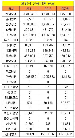 신용대출을 취급하는 17개사 중 10개사의 잔액이 늘어났으며 한화생명이 2011년 10월보다 8천755억원 늘어나며 가장 큰 폭의 증가세를 기록했다.