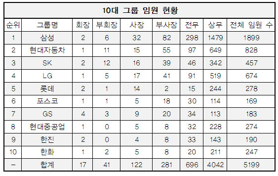 임원수가 가장 많은 그룹은 삼성으로 상무이사 1천479명을 포함해 총 1천899명에 달했다. 삼성의 임원 숫자는 10대 그룹 전체 임원의 36.5%를 차지했다.