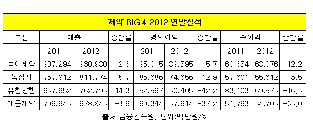 동아제약이 2위 녹십자와 매출 차이를 1천억원 이상 벌리며 부동의 1위를 지킨 가운데 2011년 4위였던 유한양행이 3년 만에 3위를 되찾았다. 4위 대웅제약은 빅4 중 유일하게 매출까지 줄어들어 풀이 죽었다.