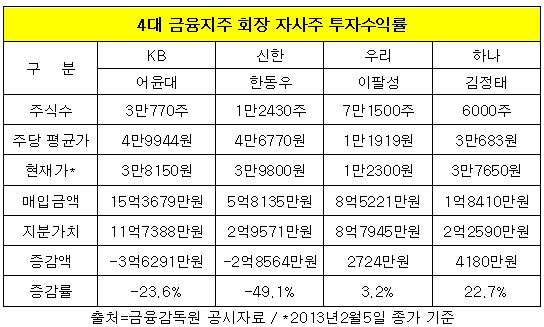 4대 금융지주 회장 가운데 김정태 하나금융지주 회장이 자사주 매입으로 가장 큰 수익을 올린 반면, KB금융지주 어윤대 회장은 투자금을 적잖이 까먹은 것으로 나타났다.