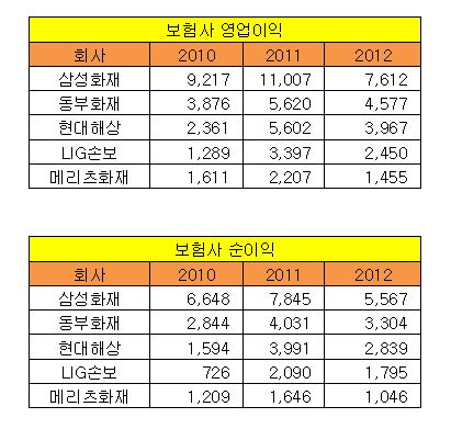 6일 보험업계에 따르면 2012회계연도(별도기준) 3분기 삼성화재는 영업이익(잠정) 7천612억원, 당기순이익 5천567억원으로 업계 부동의 1위 자리를 굳건히 지켰다.