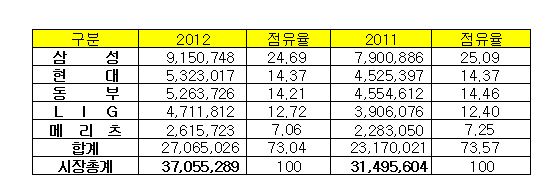 또 원수보험료는 현대해상이 2천억원 이상 앞서지만 자동차보험 부문에서는 동부화재가 앞서고 있다. 원수보험료는 보험사가 계약자에게 받은 보험료를 의미한다.