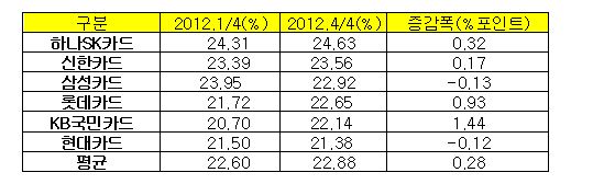 롯데카드는 연초대비 0.93%포인트 높아졌으며 하나SK카드(0.32%포인트)와 신한카드(0.21%포인트)도 수입비율이 상승했다.
