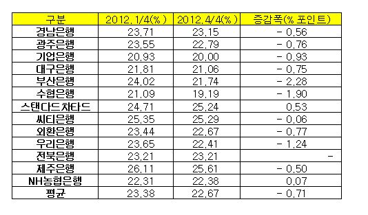 전북은행은 연초와 동일한 수준을 유지했고 나머지 10개사는 수입비율이 일제히 하락했다.