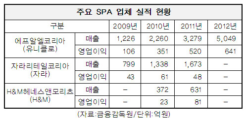 H&M을 운영하는 H&M헤네스앤모리츠(11월 결산법인)는 한국 진출 첫해였던 2010년 372억원의 매출을 올렸고 다음해 69.6%나 증가한 631억원의 매출을 기록했다. 영업이익은 23억원에서 81억원으로 무려 252.2% 늘었다.