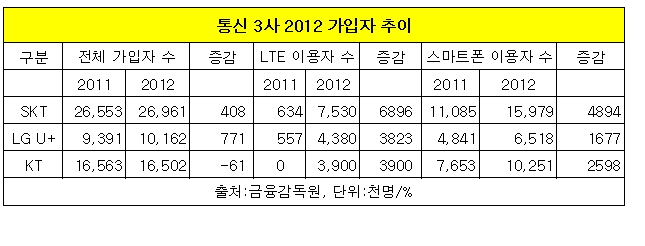 SKT는 2011년 9월 시행한 기본료 인하 때문에 증가율이 소폭(2.3%)이었지만 LG U+와 KT는 각각 18.7%와 11.8%를 기록, LTE 이용자 덕을 톡톡히 봤다.