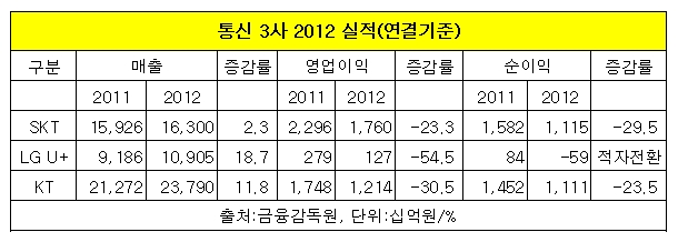 KT는 영업이익이 1조2천140억원으로 2011년보다 30%이상 줄어들었으며 순이익 역시 1조1천110억원으로 23.5% 줄었다.