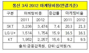 2011년 대비 마케팅비용은 SKT 7.4%, LG U+ 15.9%, KT는 15.6% 증가해 전년대비 2천억원 이상을 더 투입한 셈이 됐다.