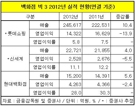 7일 금융감독원과 증권업계에 따르면 현대백화점은 지난해 매출 1조5천200억원, 영업이익 4천263억원을 기록했다. 2011년에 비해 매출은 5.6% 증가했지만 영업이익은 2.4% 감소한 수치다.