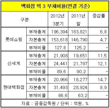 지난해 3분기말 기준으로 현대백화점의 부채비율은 66.6%로 재작년말 63.2% 보다 다소 높아졌지만 백화점 빅3 가운데 가장 낮았다.