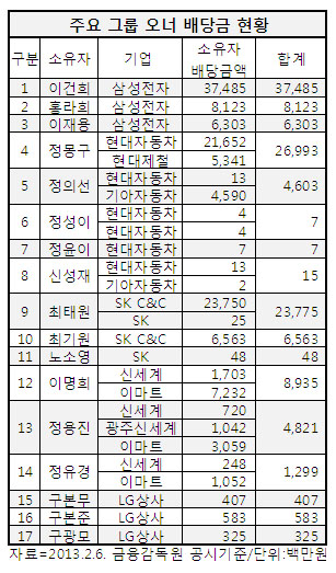 뒤이어 현대자동차 정몽구 회장과 SK 최태원 회장이 각각 200억원 대의 배당을 받을 예정이다. LG그룹은 구본무 회장이 최대주주인 (주)LG의 배당 공시가 이뤄지지 않아 아직 정확한 집계가 이뤄지지 않았다.