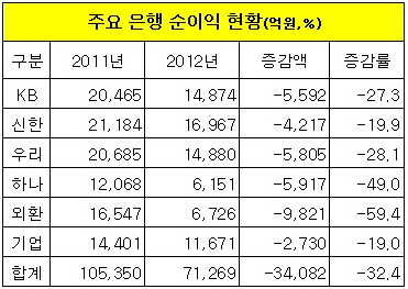 KB, 신한, 우리, 하나, 외환, 기업 등 시중은행 6곳의 순이익 규모는 2011년 10조5천350억원에서 지난해 7조1천269억원으로 32.4%나 쪼그라들었다.