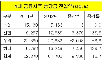 4대 금융지주의 대손충당금 적립액은 2011년 5조2천870억원에서 지난해 6조1천700억원으로 16.7% 증가했다.